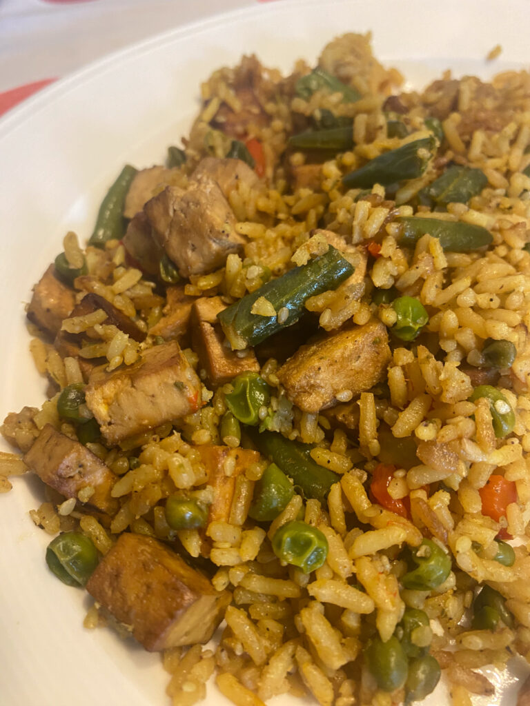 - Den Reis mit Gemüse und Tofu auf Teller verteilen.